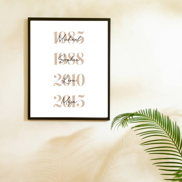 Familienposter mit Namen und Geburtsjahren, eine tolle Option für ein personalisiertes Geschenk für Ihre Familie oder Freunde. Diese Bilder sind auch eine personalisierte Dekoration für Ihr Zuhause.